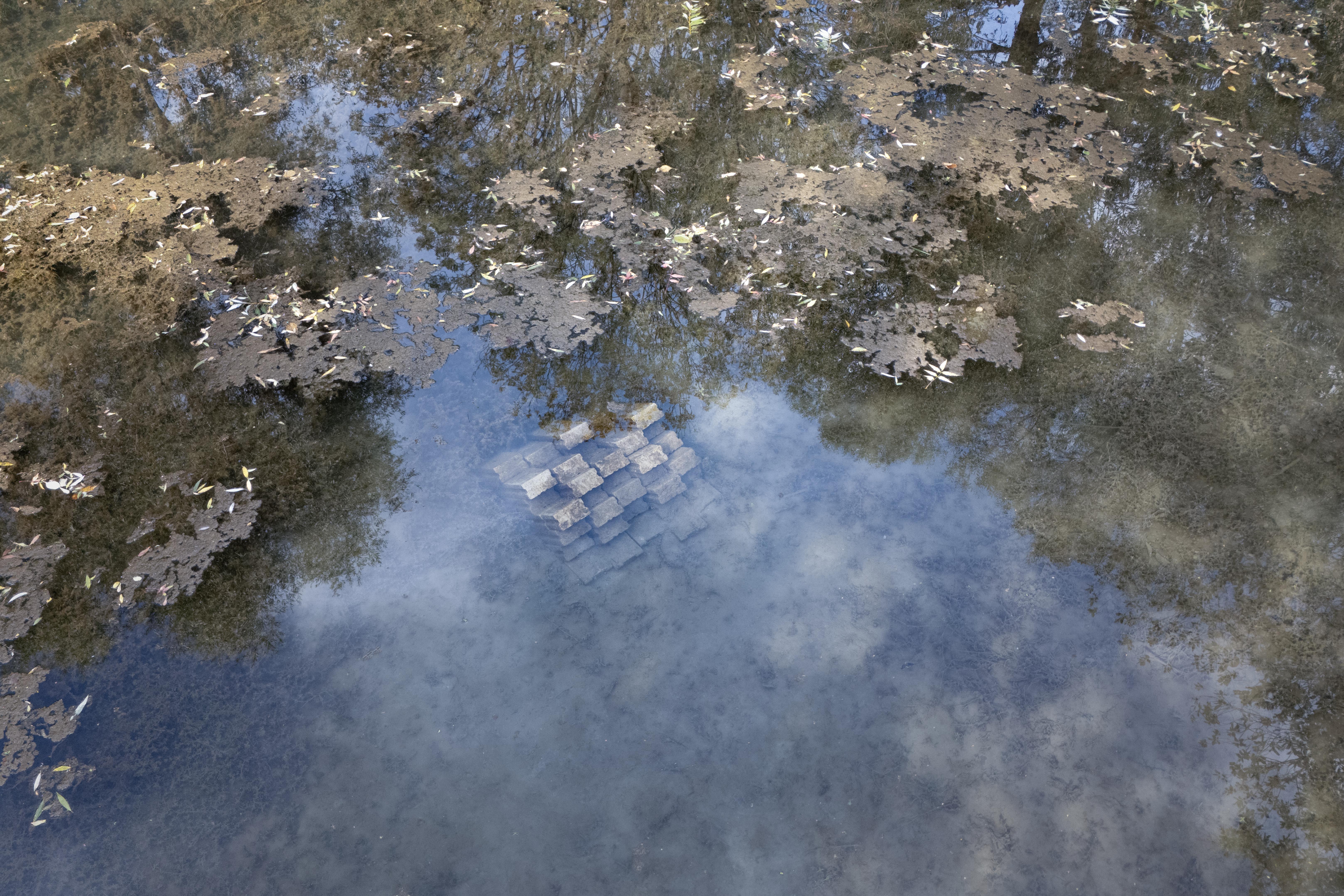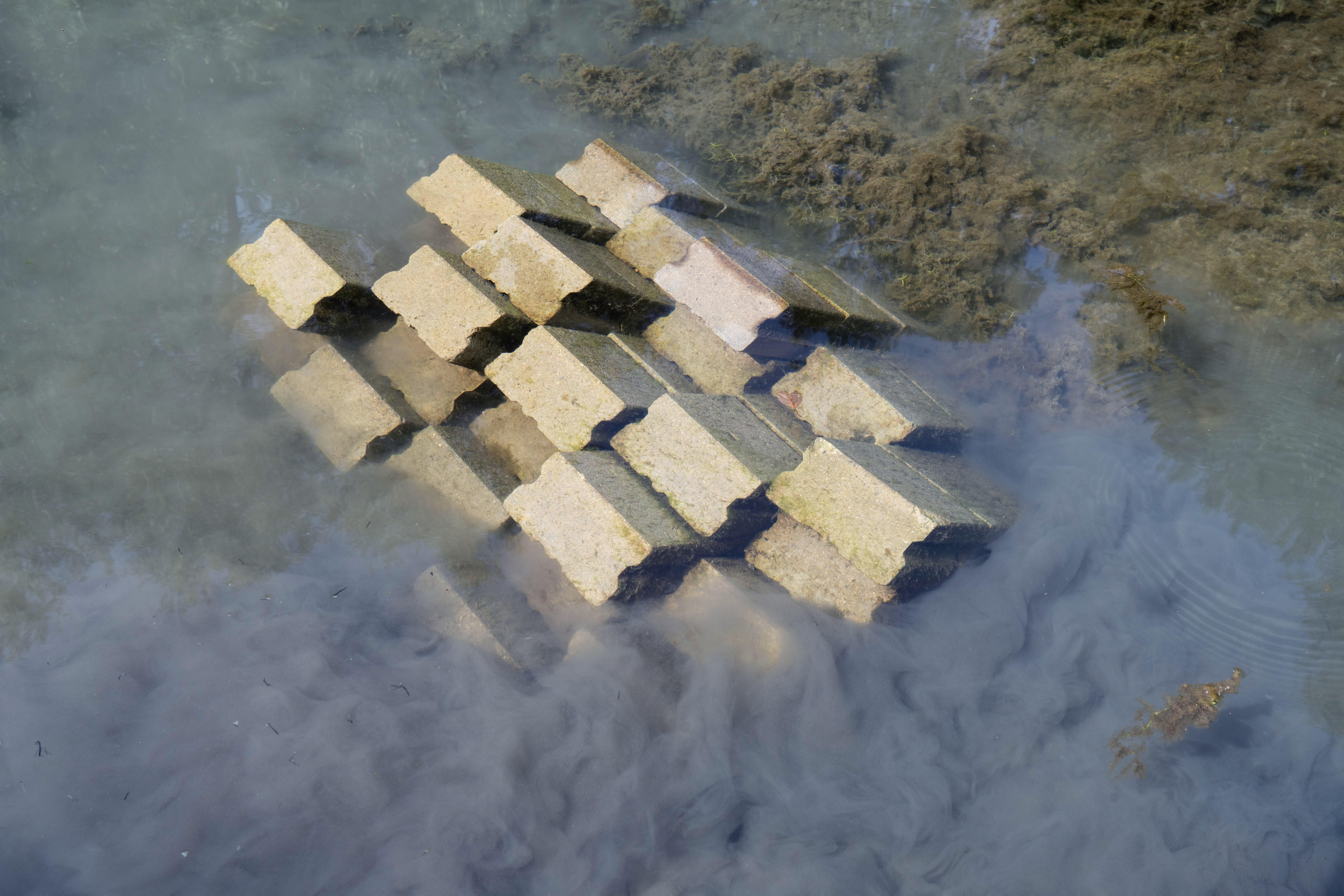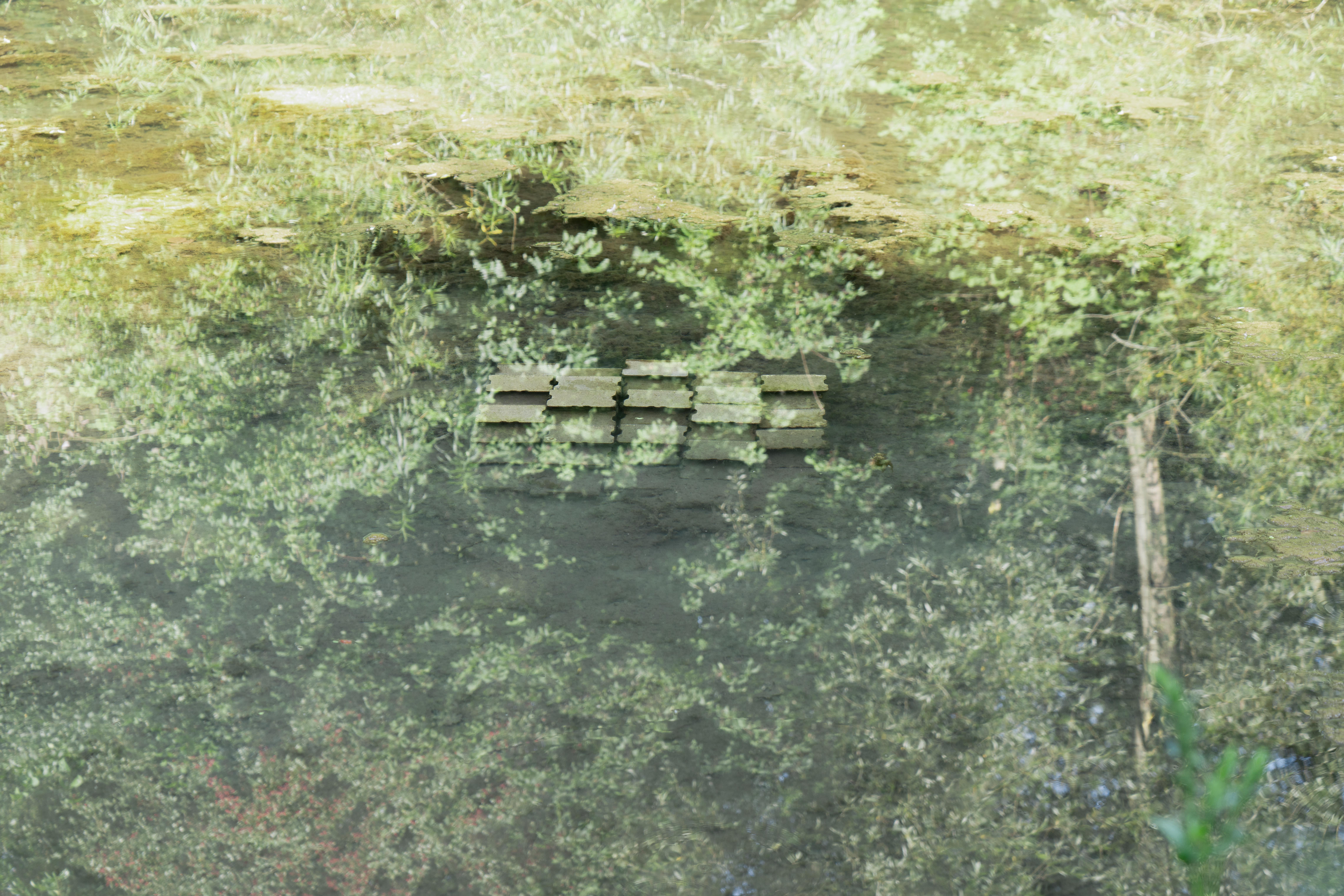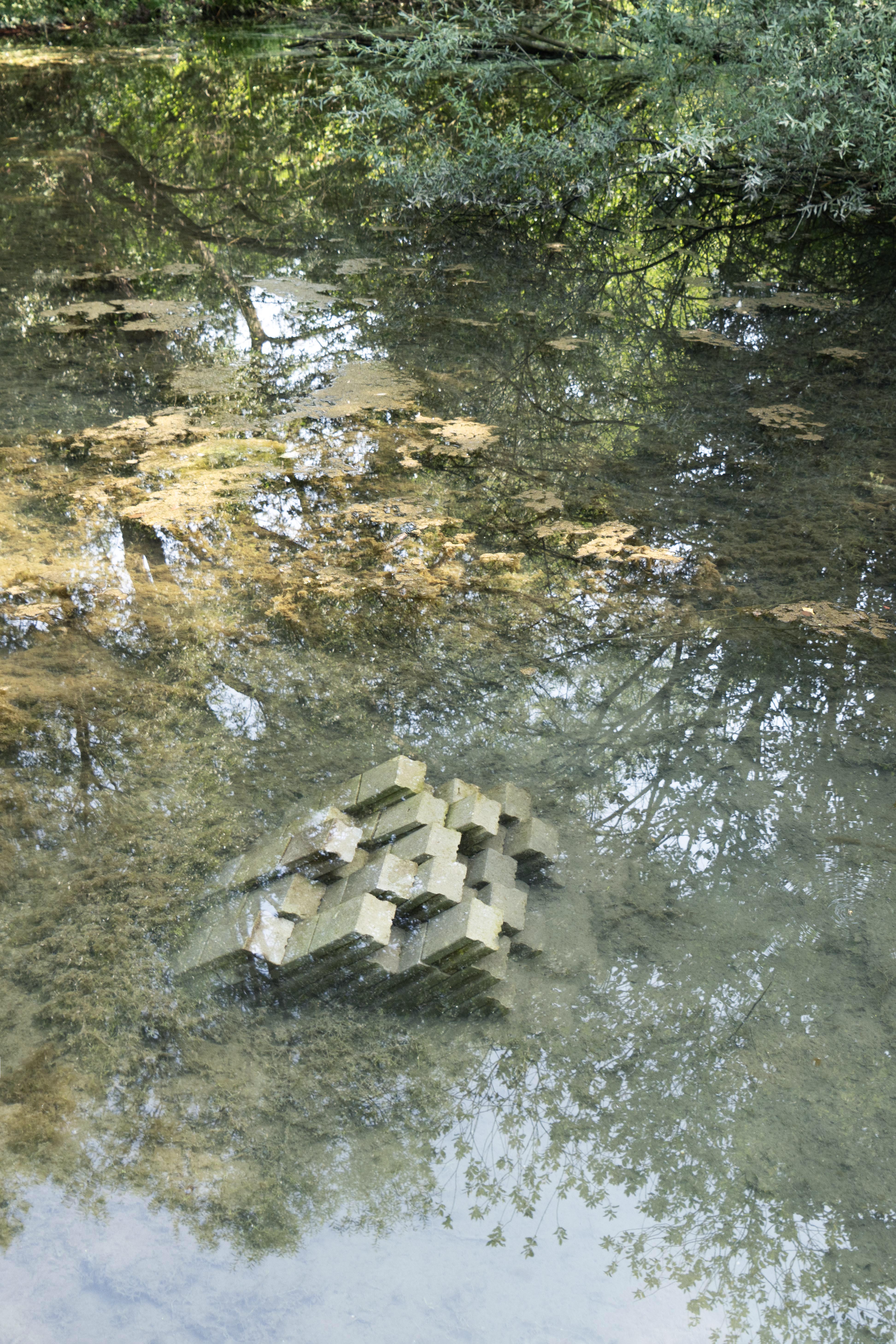 The third island is located in the Pader-Alme Canal, in a widened area with very calm, pond-like water. About 2 m from the bank, rectangular concrete paving stones are stacked underwater to form a structure that remains below the surface. The stones are arranged to leave empty spaces between them. To avoid excessive load on the riverbed, pallets are used as a base for the stones.